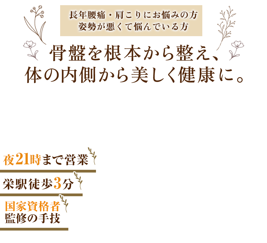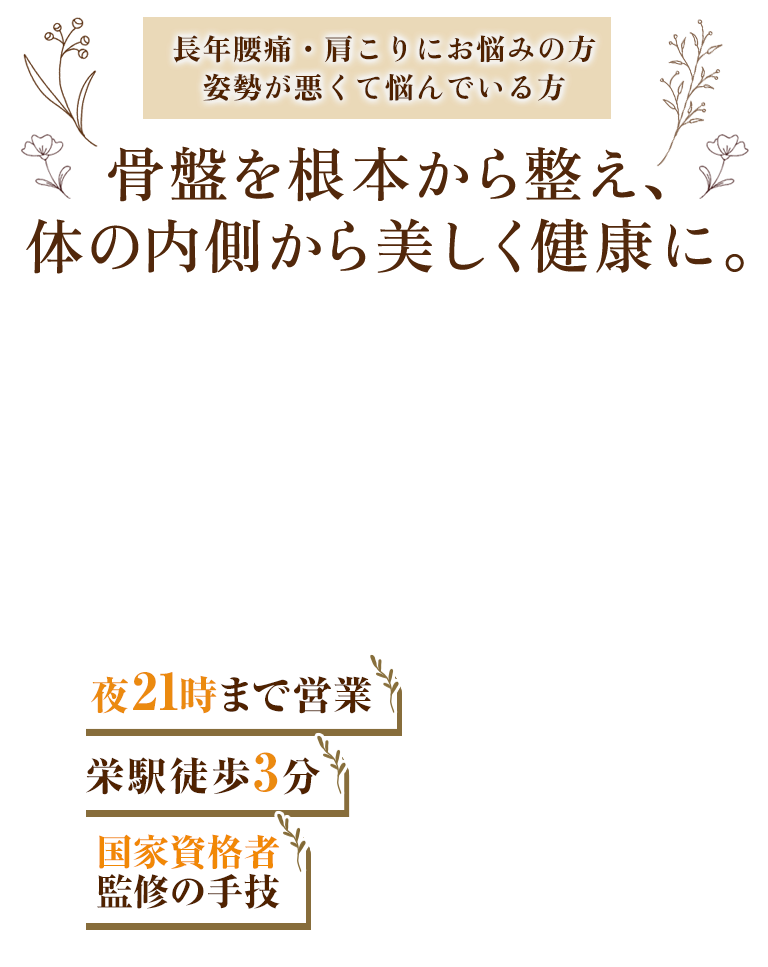 MAKANA整体サロン 栄院は、症状の再発防止も徹底しています。肩こり、首こり、腰痛などが改善された後も施術やアドバイスによって、症状の再発を防止します。当院は仕事帰りに通えるように21時まで営業をしています。駅近な場所に位置して、栄院は、栄のユニモール出口から徒歩30秒!